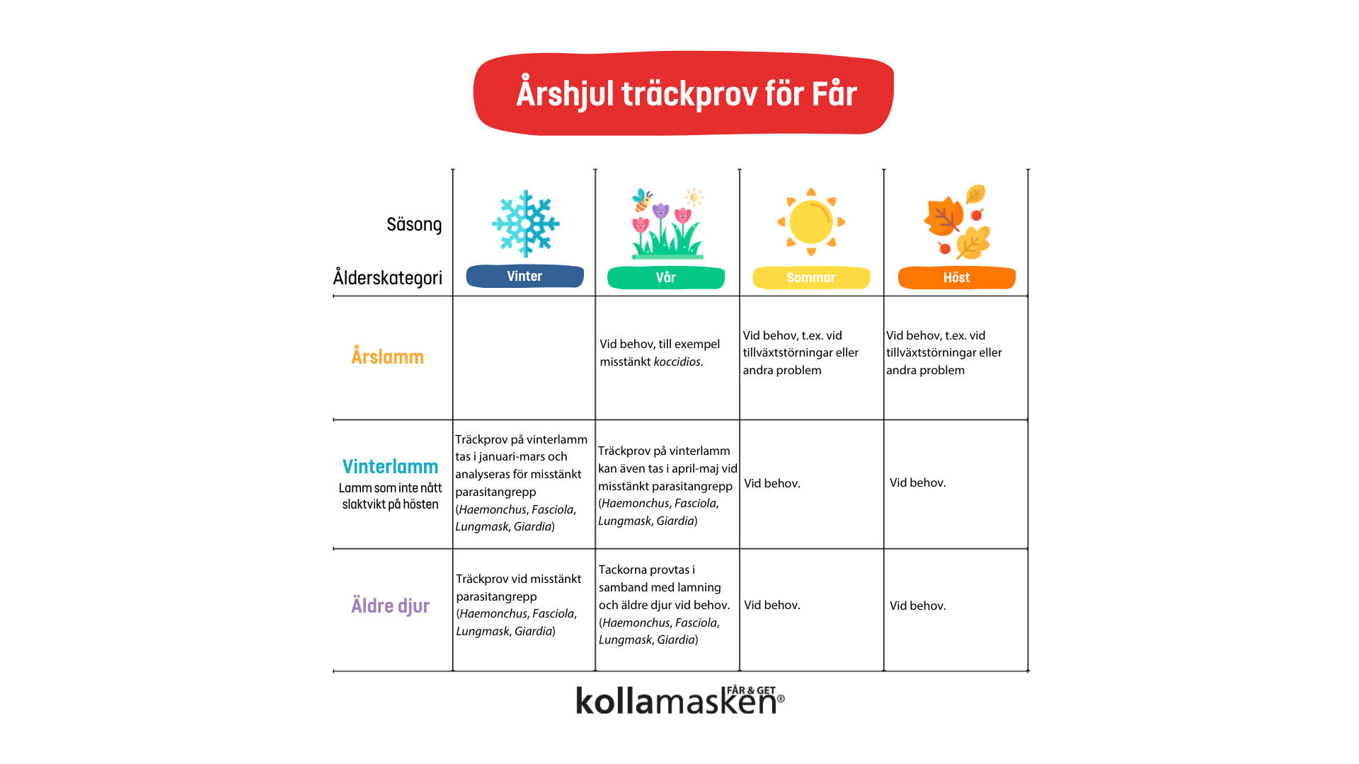 Tackorna provtas i samband med lamning och äldre djur vid behov. (Haemonchus, Fasciola, Lungmask, Giardia)